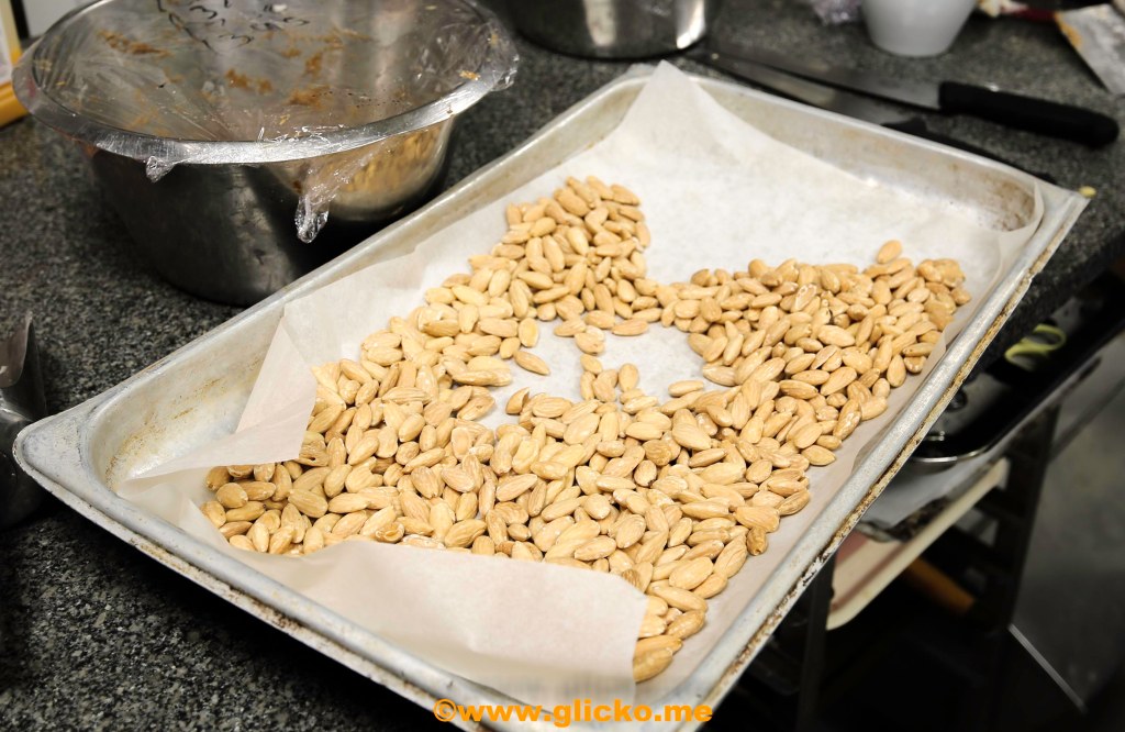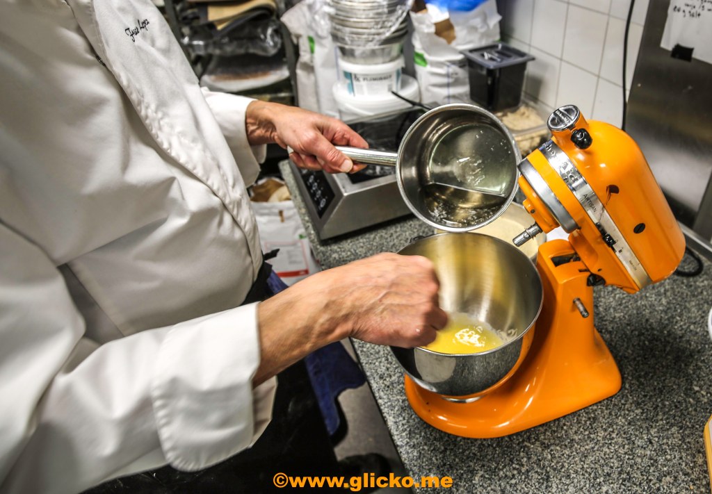 Nu gör Frasse sockerlagen till, Turron yema som är ett spanskt godis. Äggulorna blandas i sockerlagen som skall vara 115 grader. Efter det så häller Frasse i mandeln och vispar ihop det hela med hjälp av maskinen.