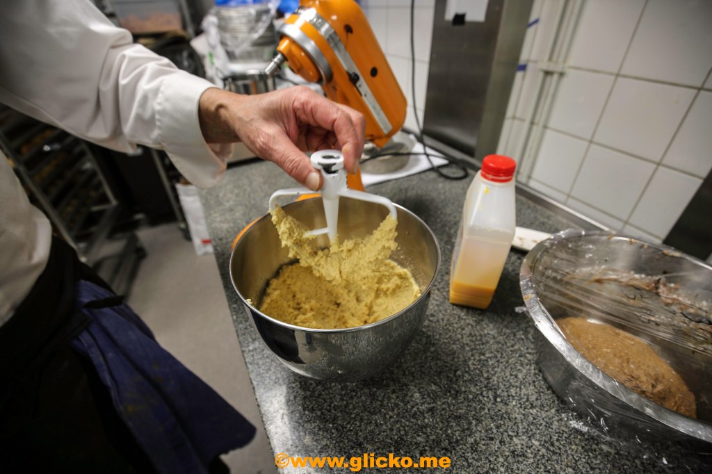Nu börjar Frasse blanda till det som skall bli ett ciabatta vörtbröd och ett vanligt ciabattabröd. Vid mindre degar använder han bara en bunke och en slickepott, men vid större degar så kör han dem i en maskin.