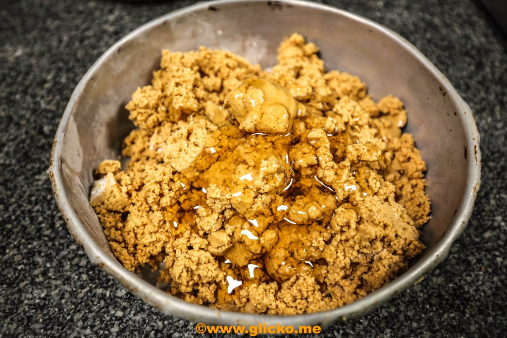 Vill man så kan man även göra Turron yema med jordnötter eller hasselnötter tillägger Frasse. Nu är massan klar som man kan göra som bollar eller vilken form man vill ha det. Frasse väljer att lägga det på en plåt och platta till det.
