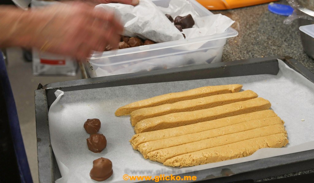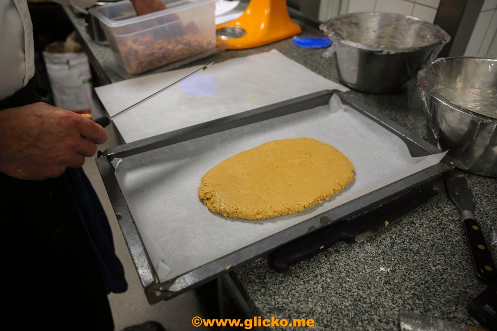 Efter att smeten blandats en stund så trycker han ut den på en plåt. Vill man så blandar man i bitar av mandel i degen eller lägger det ovanpå. Vill man kan man även lägga lite florsocker uppe på som dekoration eller vit choklad eller vad man tycker om. Nu har Frasse tillverkat 700 gram Turron jijona som julgodis.