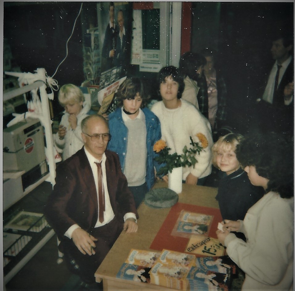 Bosse Larsson signerar allsångshäfte i Angered. Foto privat.