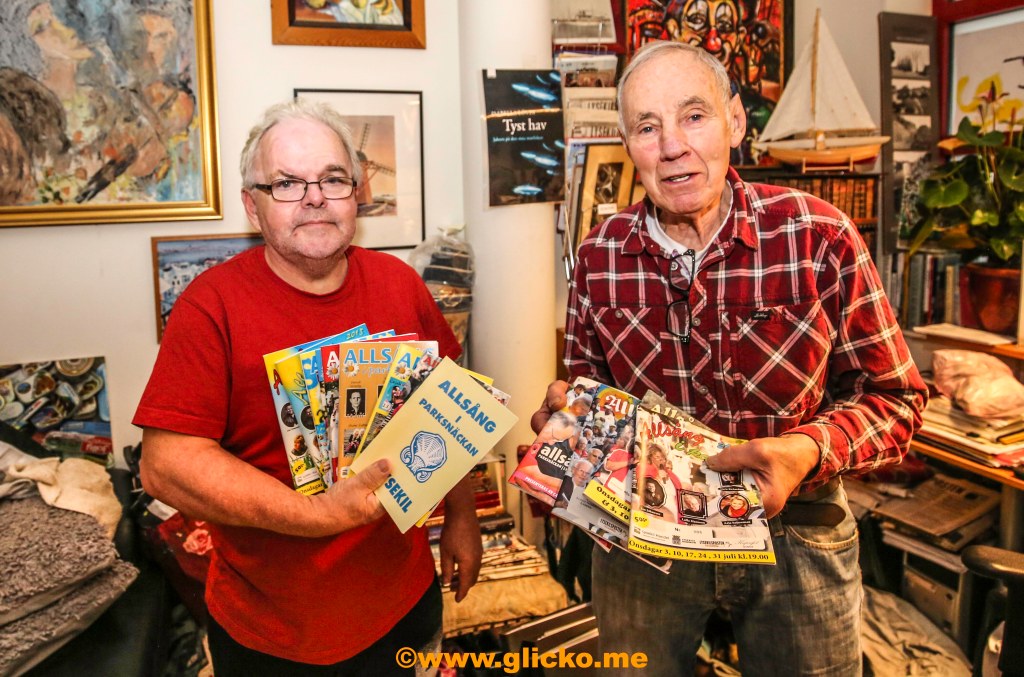 Roar och Hasse med några av alla allsångshäfte som tryckts genom åren