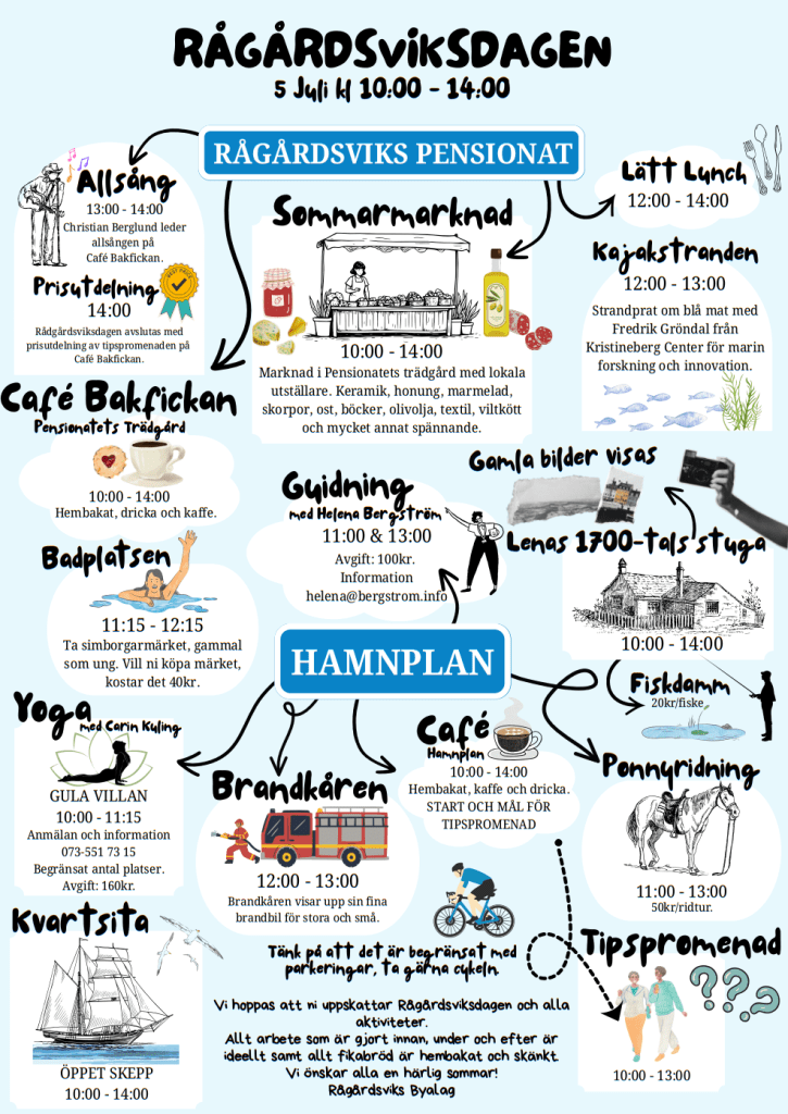 Vidare så blir det tipspromenad för stora och små, Fredrik Gröndahl från Kristineberg kommer att ha ett strandprat med fokus på mat från havet. Det blir även allsång med Christian Bergkvist, vi hoppas att det finns något för alla under Rågårdsviksdagen.