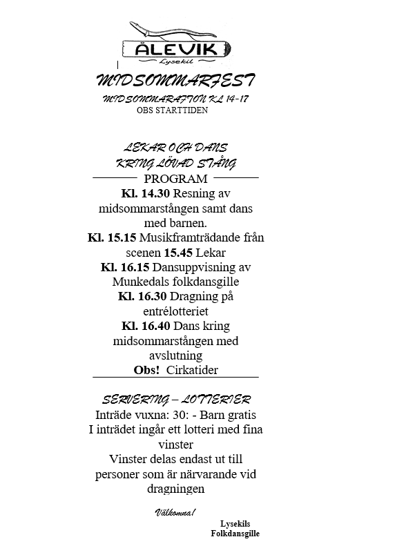 Midsommarfirande i Ålevik kl. 14:00-17:00.