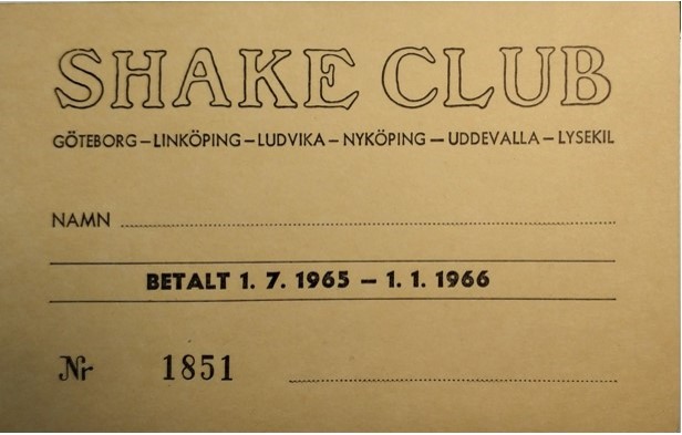 Här är medlemskortet som fanns 1965 till Shake Club. Biljettpriset till vanliga kvällar var 5 kronor för medlemmar och 6 kronor för icke-medlemmar.