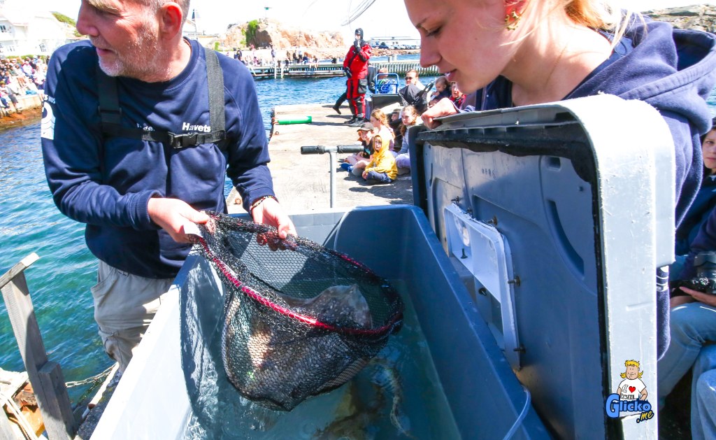 Dykare fanns i vattnet som tog emot fiskarna i en stor plastburk och som sedan tog ut dem på lite djupare och släppte dem. Det var dykare från Universum i Göteborg och från Havets Hus var Martin Stjernstedt dykare.