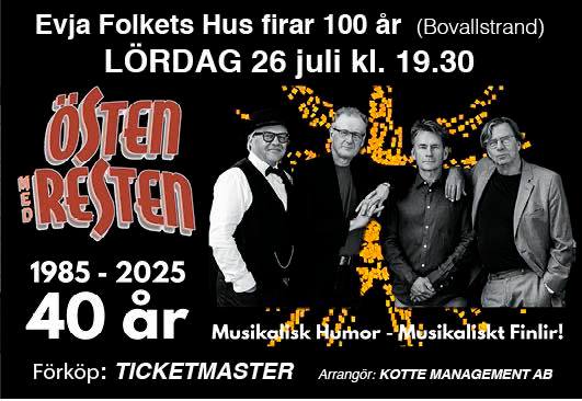 I år firar Evja Folkets Hus 100 år och med detta firar man hela året med att göra lite olika arrangemang. I går kom gäster långt ifrån som firar 40-årsjubileum. Det var ingen mindre än Östen med Resten som gästade Evja Folkets Hus och bjöd på helproffsig underhållning. Kotte Management stod för bokningen av Östen med Resten till Evja Folkets Hus. Rolle Thörngren skötte ljudet.