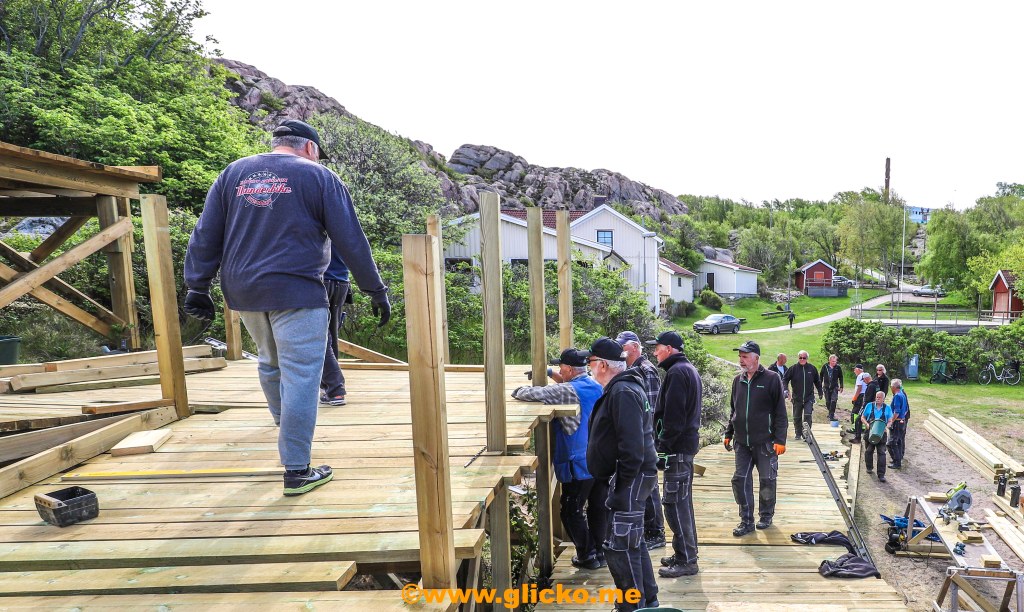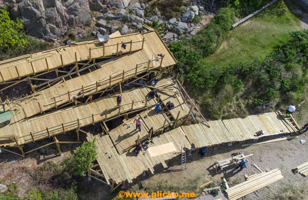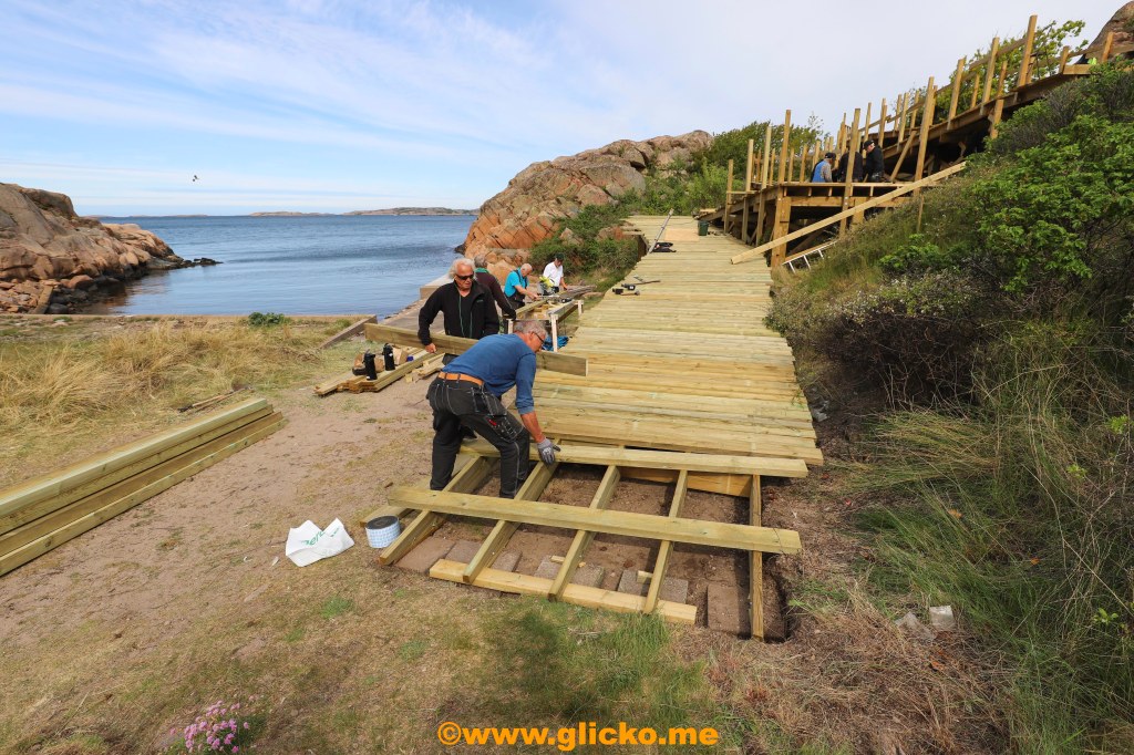 Just nu väntar man på att Allfix skall sätta fast de stålställningarna som håller den delen där promenaden går utmed berget skall fästas. Lysekils Vänner har även denna gång fått fantastisk hjälp av Aram Rubinstein, som äger helikopterfirman HeliAir Sweden med att lyfta virket som skall ut till byggandet av promenaden.