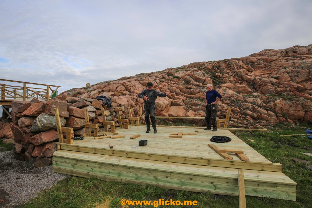 Lysekils Vänner har startat höstsäsongen med att bland annat göra en nedgång från portalen på vägen till hopptornet som går ner till beachvolleybollplanen. När man kommer in genom stenmuren direkt till vänster håller de på att färdigställa en 5 x 5 meter solaltan med bänk och bord och där är meningen att man skall kunna sitta och sola eller ta en kopp kaffe med mera.